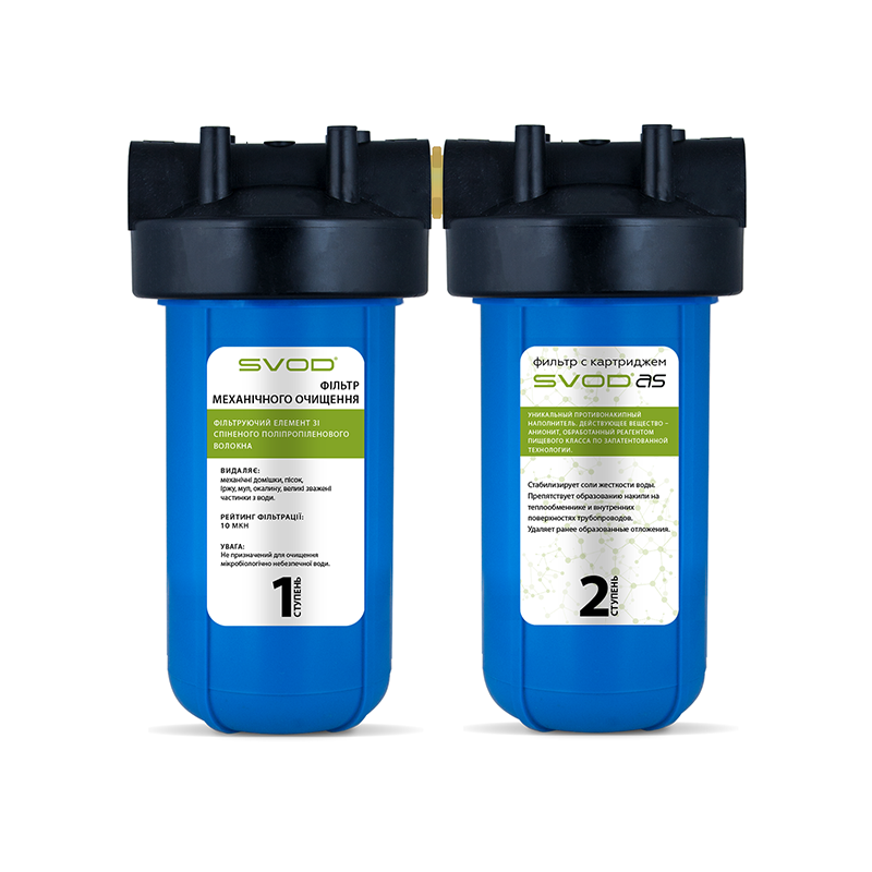 2 стадія - антинакипный фільтр "SVOD-АС": діюча речовина «СВОД-АС» являє собою аніоніт, оброблений хімічно активними компонентами за спеціальною технологією. Вода, що проходить через фільтр, здобуває нові властивості, які не дозволяють солей жорсткості випадати на поверхні теплообміну і запірної арматури.